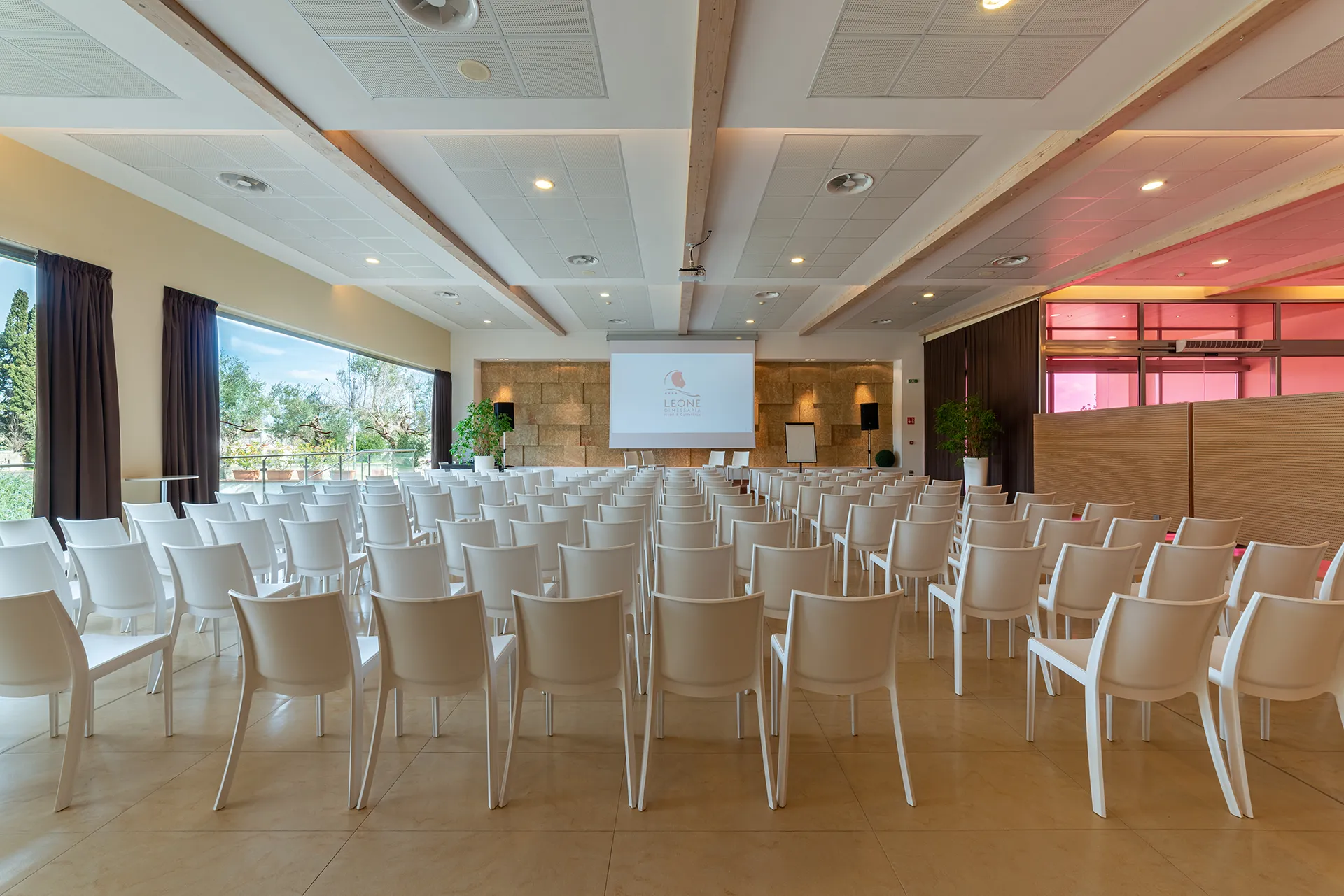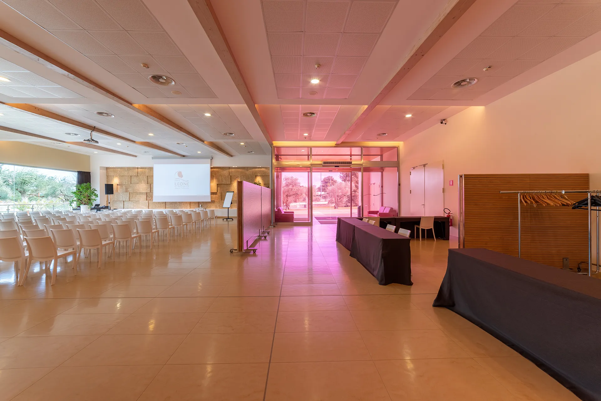 Con il suo ambiente ampio e luminoso, la sala Foyer dispone di un’intera parete a vetri affacciata sull’area verde con cascata, è quindi in grado di rendere unico qualsiasi evento, dal banchetto al convegno, dalla conferenza alle esibizioni di arte performativa.